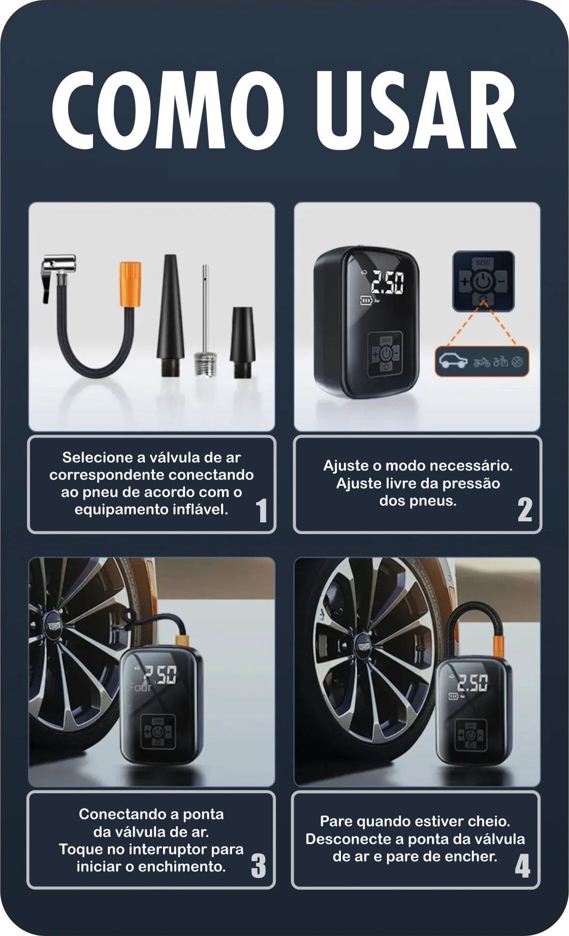 Adequado para carros, motos, bicicletas, barcos e bolas esportivas, é a ferramenta versátil que atende a todas as suas necessidades de inflação.