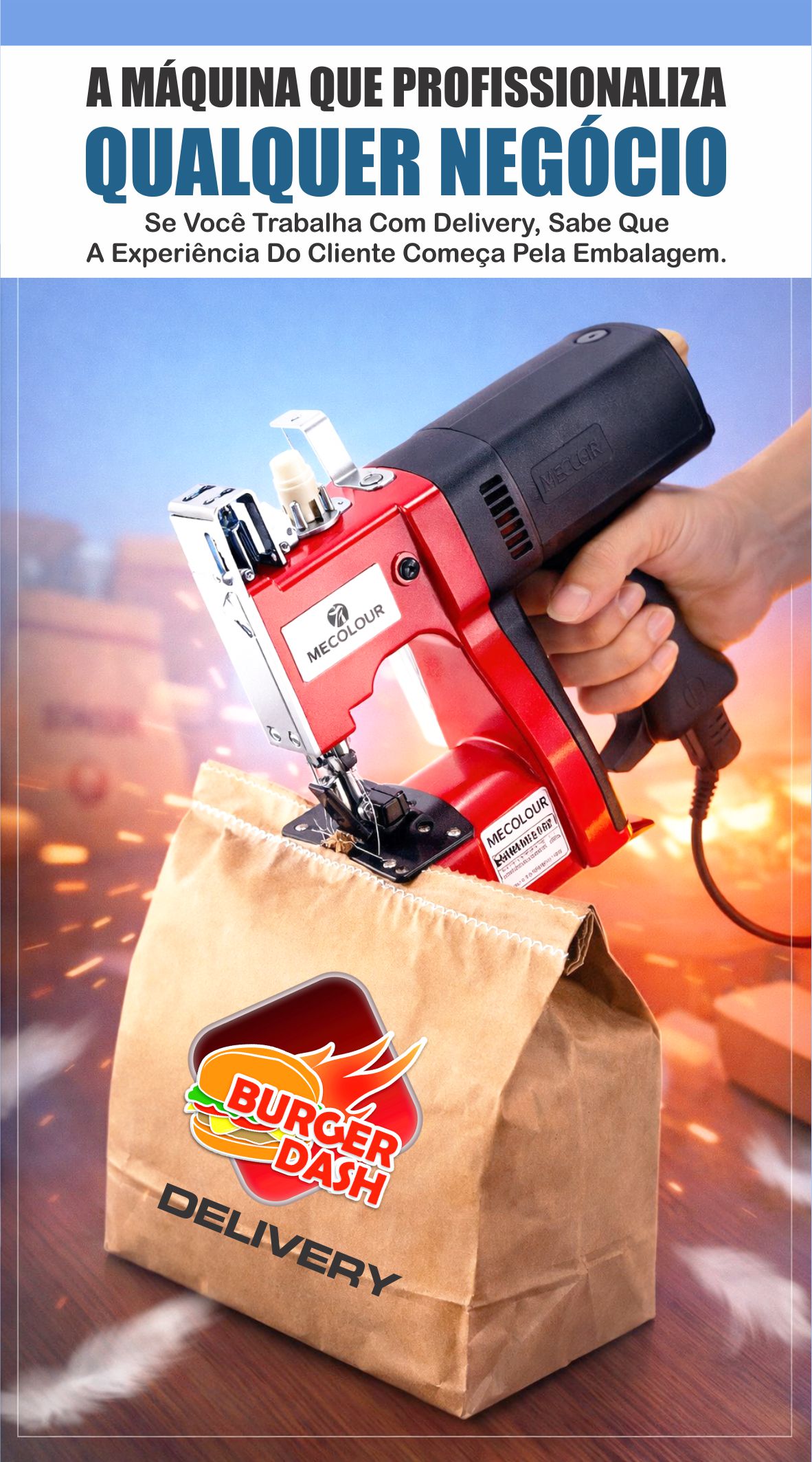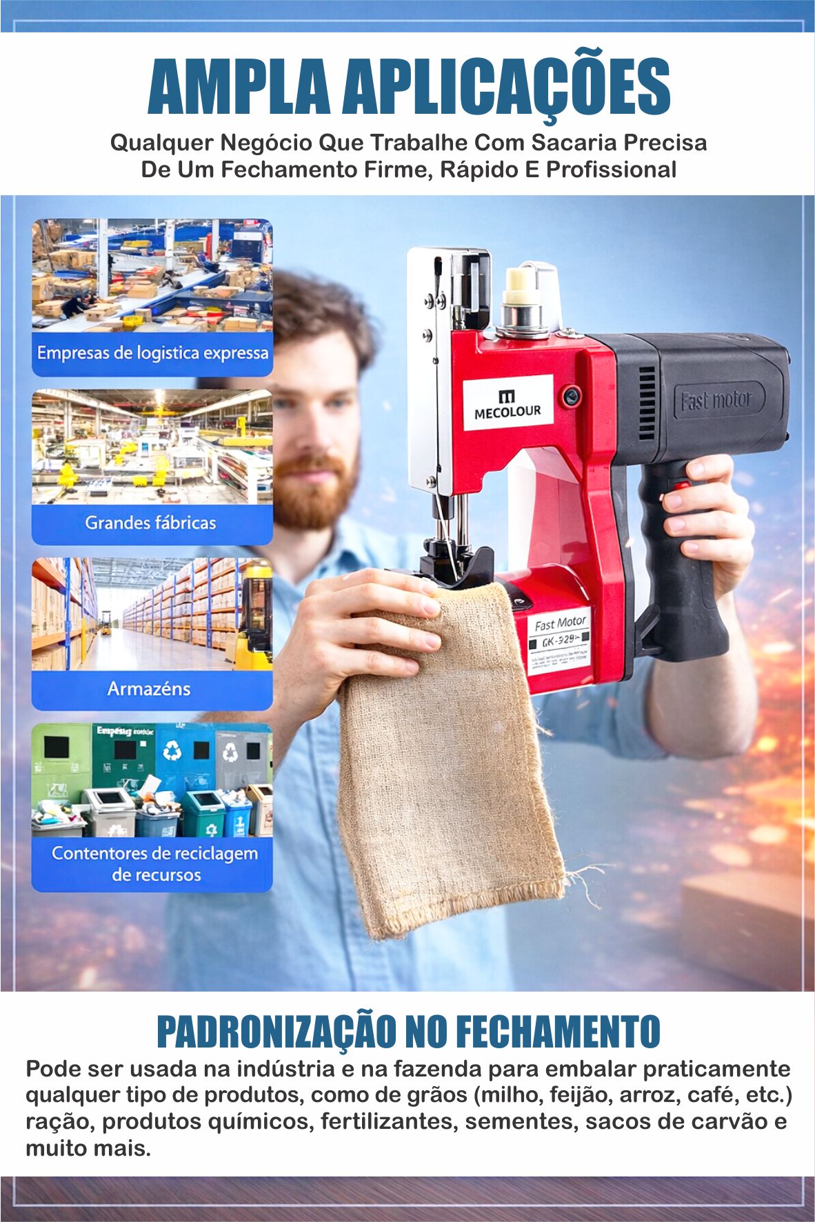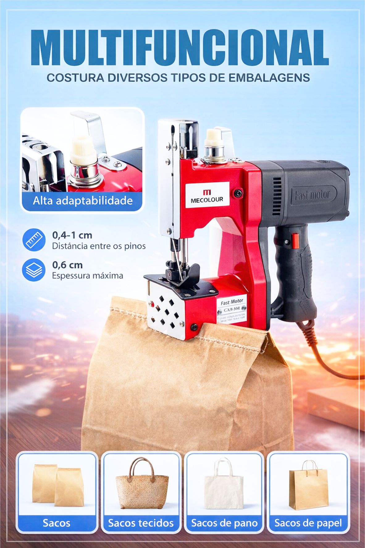 A Máquina De Costurar Sacos Portátil Compreex costura ráfia, plástico, juta, linhagem, tecido, sacos de papel (monofolha), sombrite e lona para aviário.