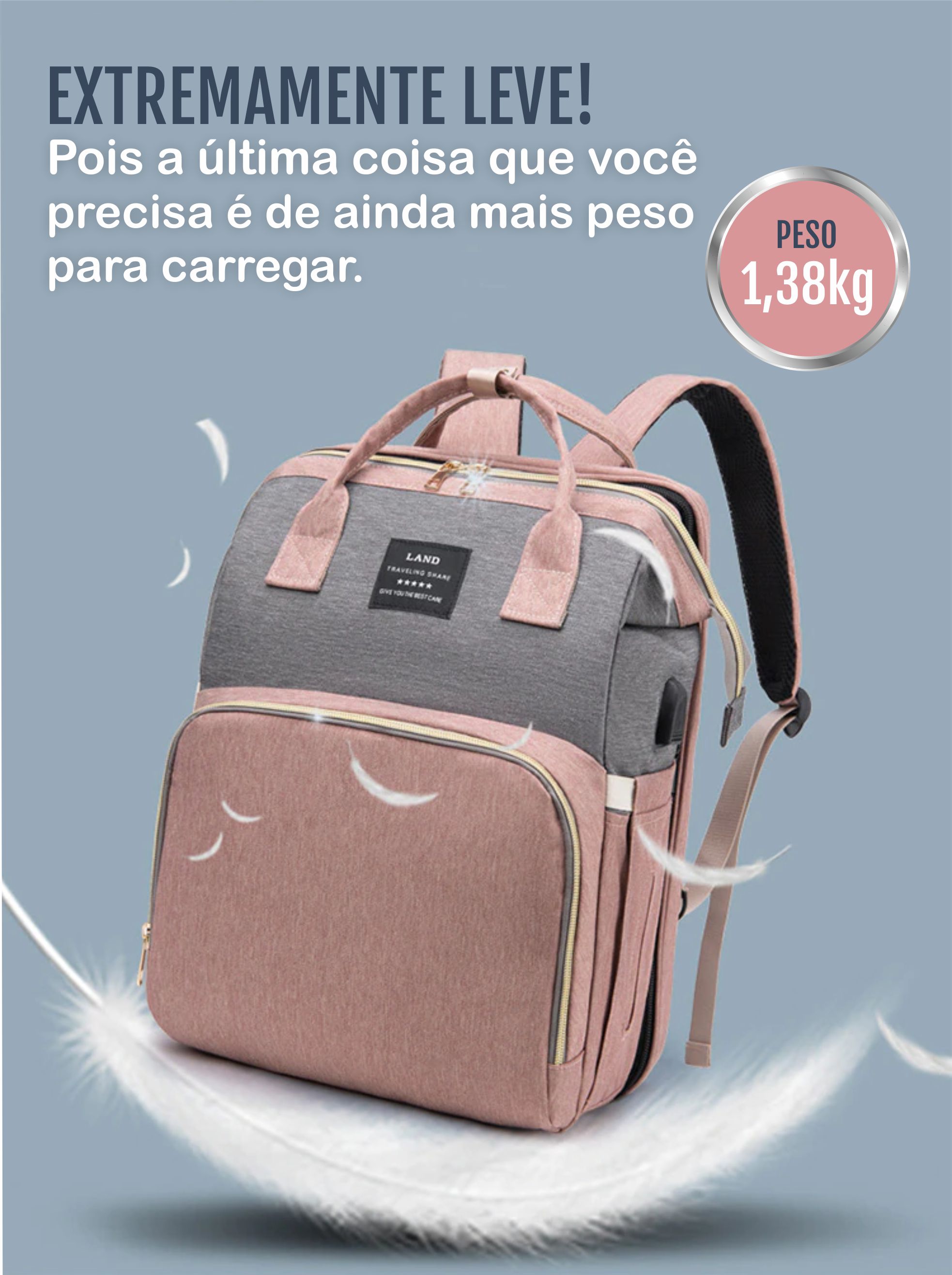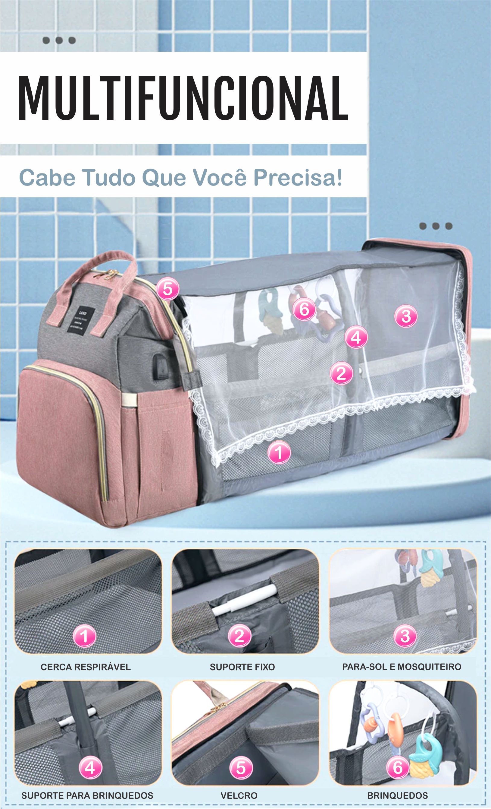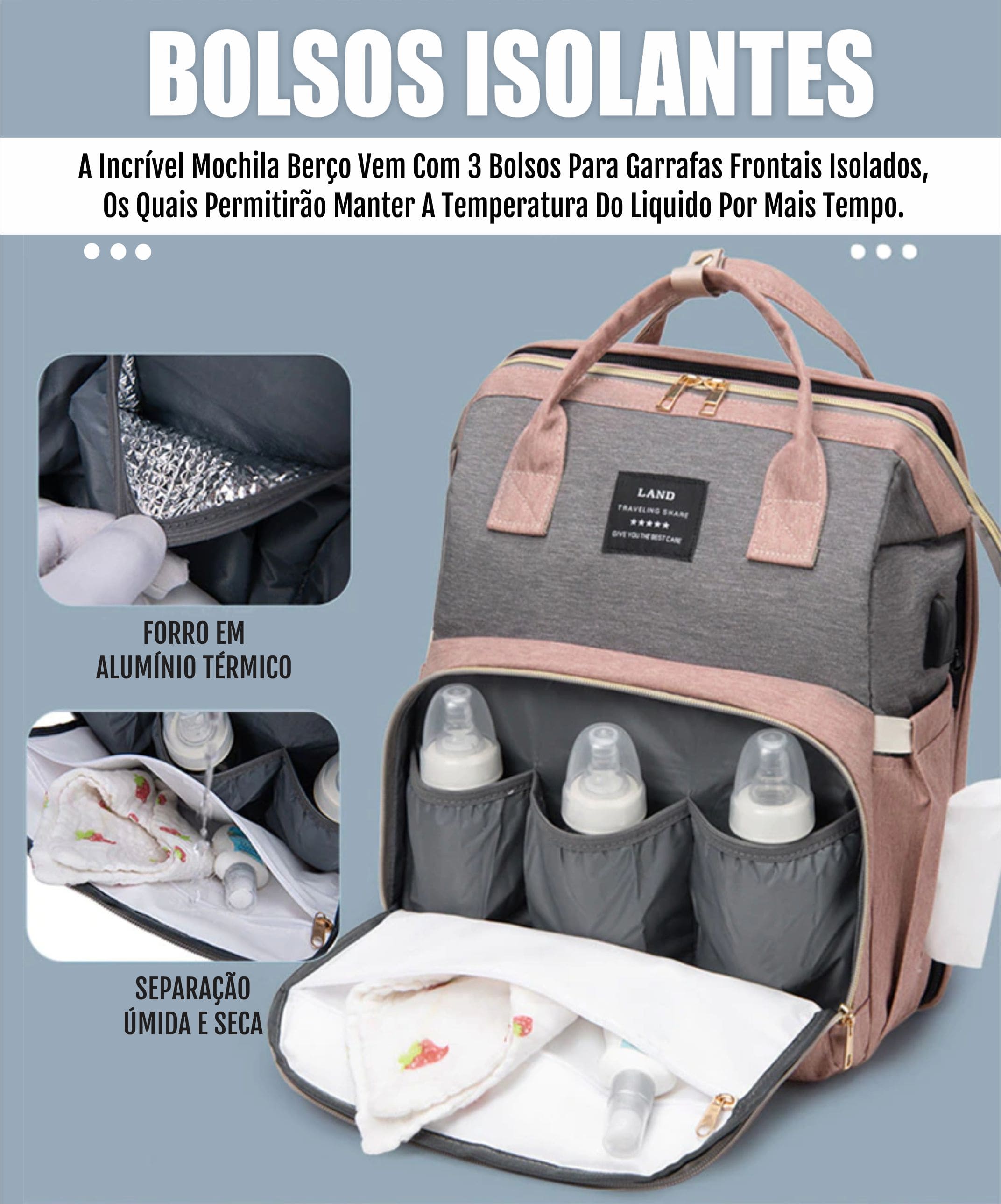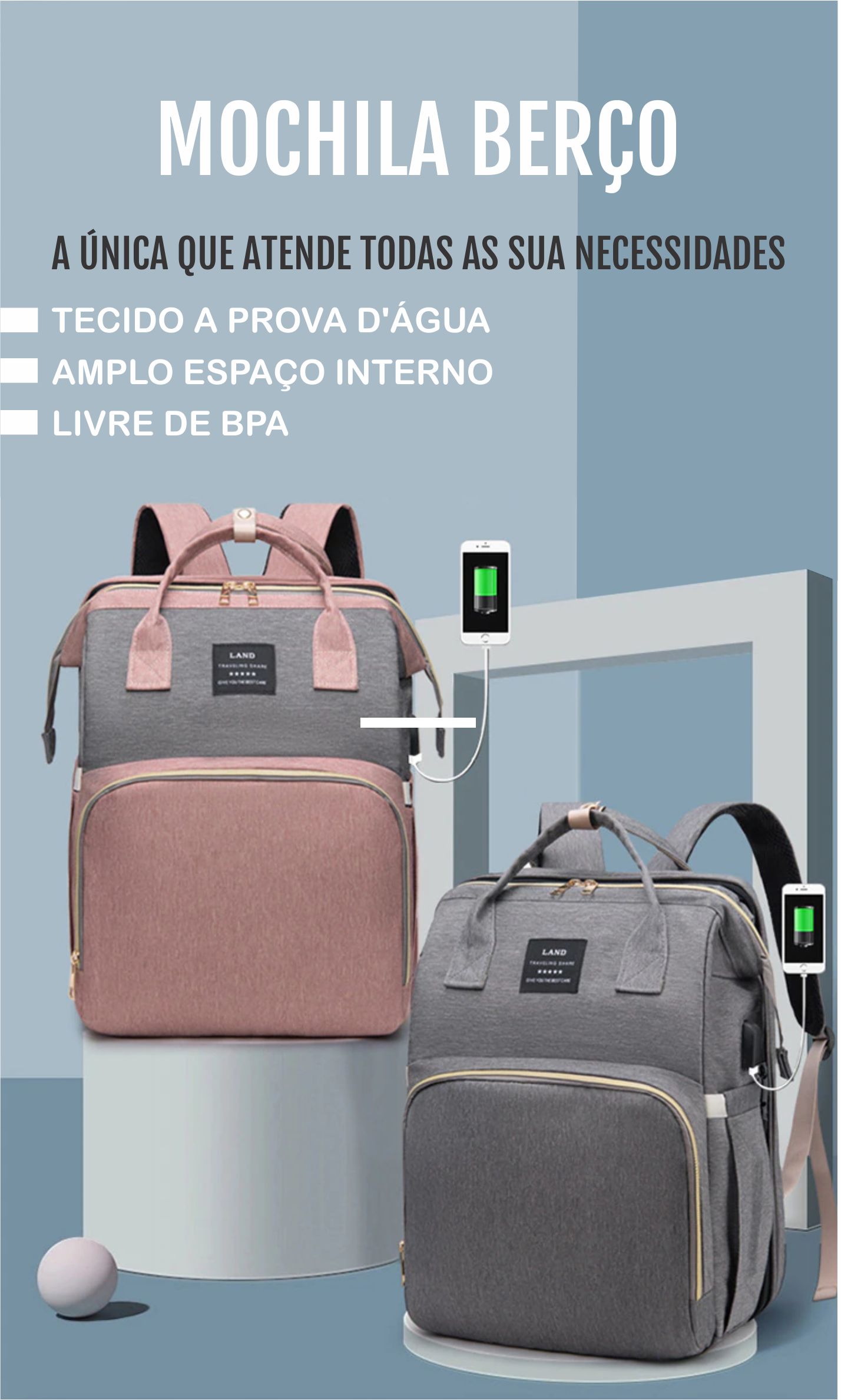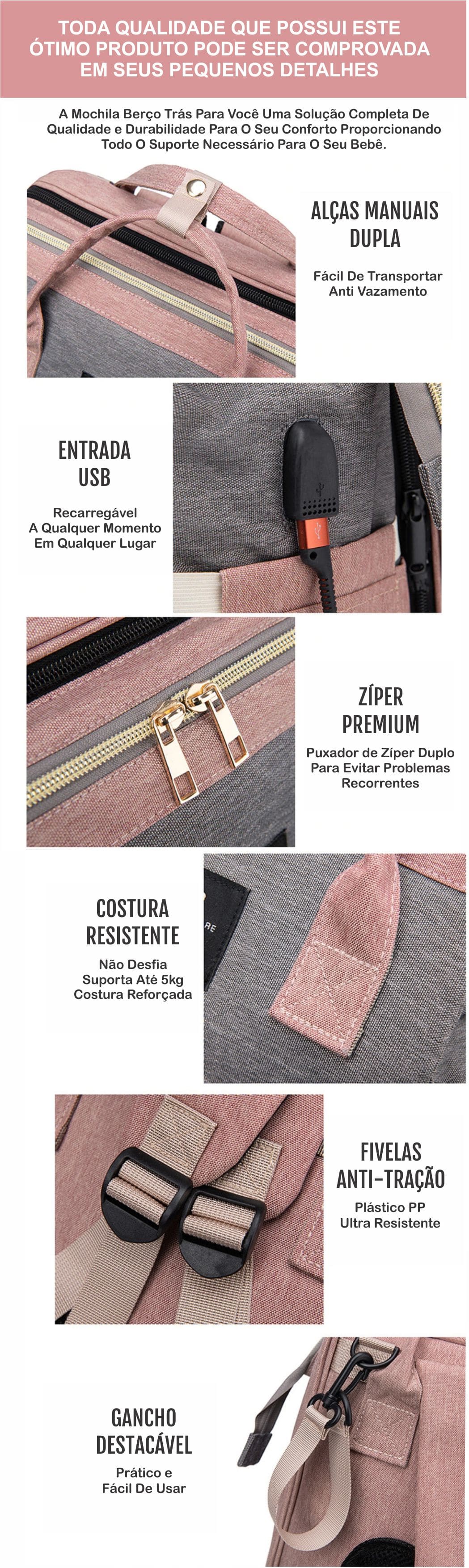 A Mochila Berço é um produto multifuncional, ela pode ser usada como bolsa/mochila maternidade ou até mesmo berço portátil devido ao mecanismo único de transformação da bolsa em berço. As alças são super resistentes e possuem revestimento inteiramente em tecido impermeável.