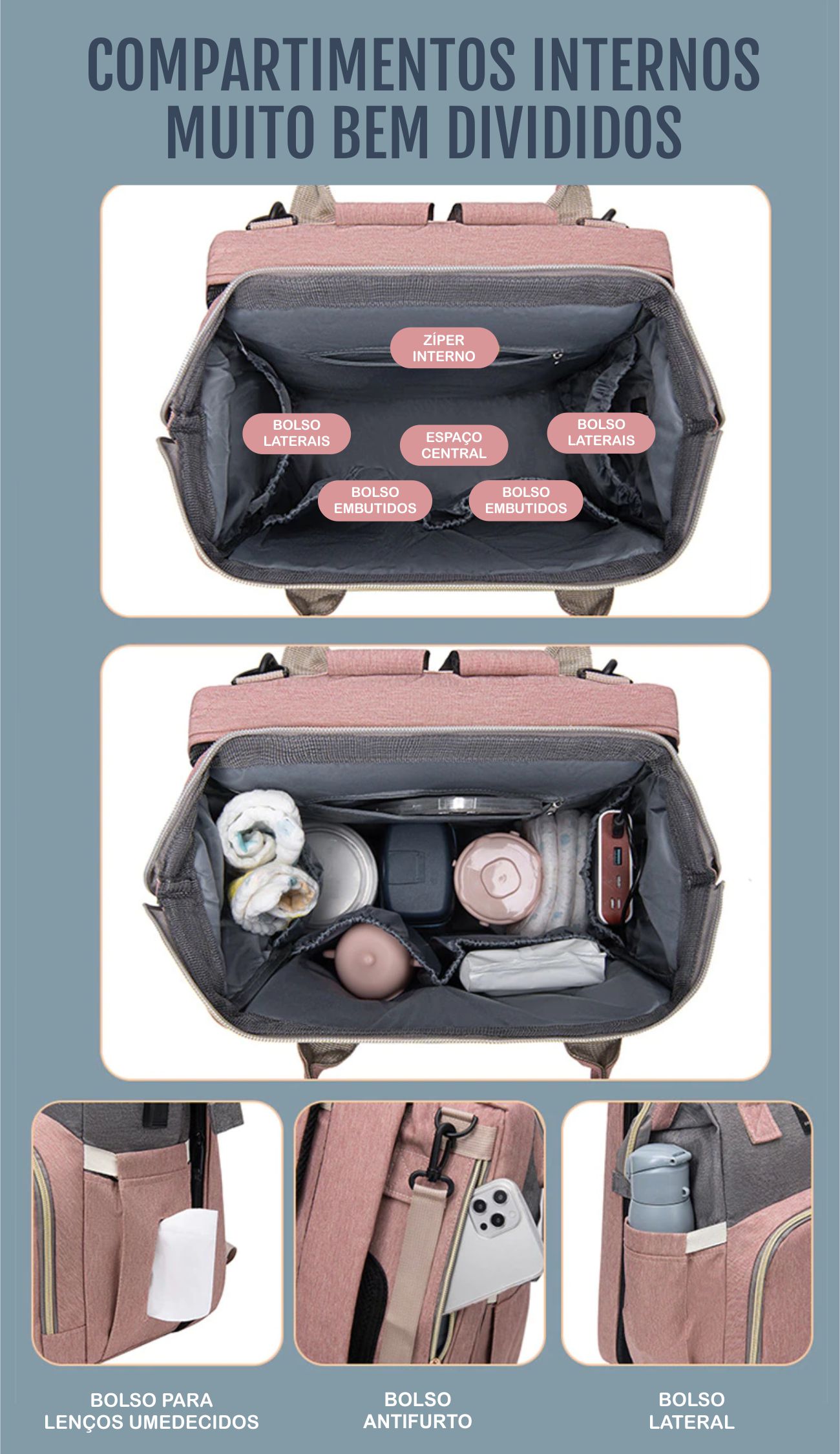 O sistema de bolsos inteligentes permite que você carregue roupas, mamadeiras, garrafas, lenços umedecidos, chupeta, fraldas, cobertor, alimentos em geral e muito mais.