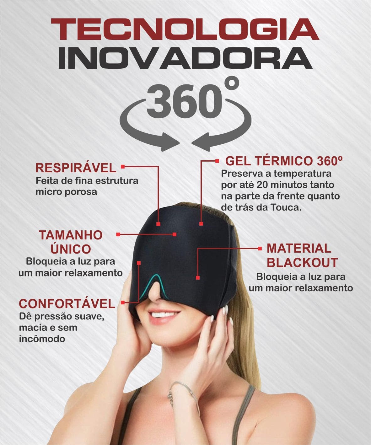 Ela contém um gel termodinâmico e deve ser mantida no freezer antes de ser usada e, quando colocada na cabeça, ajuda a reduzir a inflamação e a dilatar os vasos sanguíneos, o que causa o alívio imediato de todos os tipos de dores de cabeça, enxaqueca, tensão, pressão, sonolência e também o estresse.